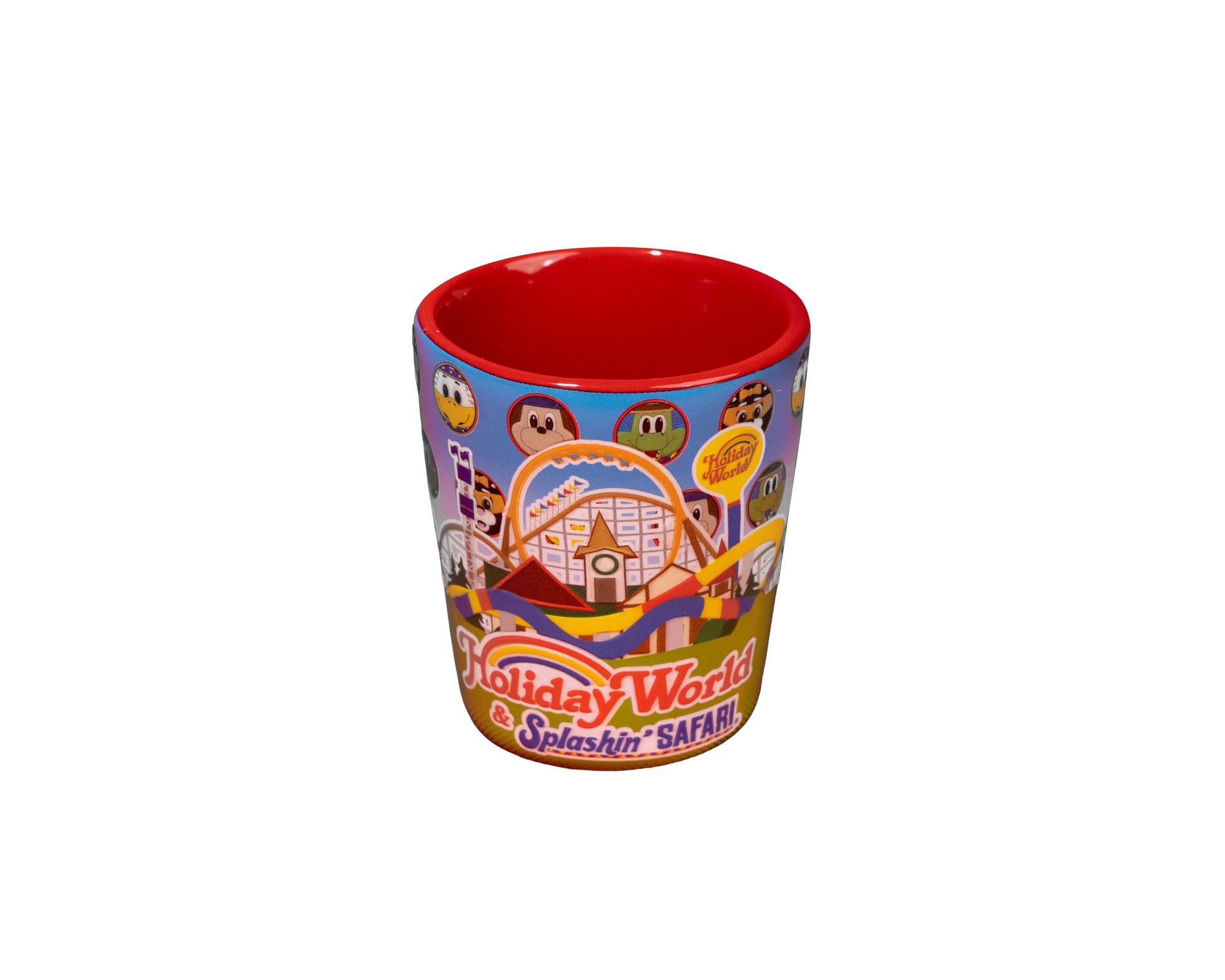 This fun shot glass has a raised texture park scape that is colorful and vibrant. This shot glass features all four iconic characters with all of the rides and attractions that you love.